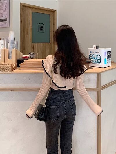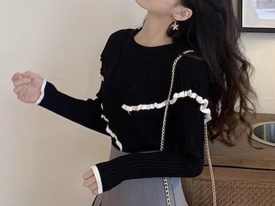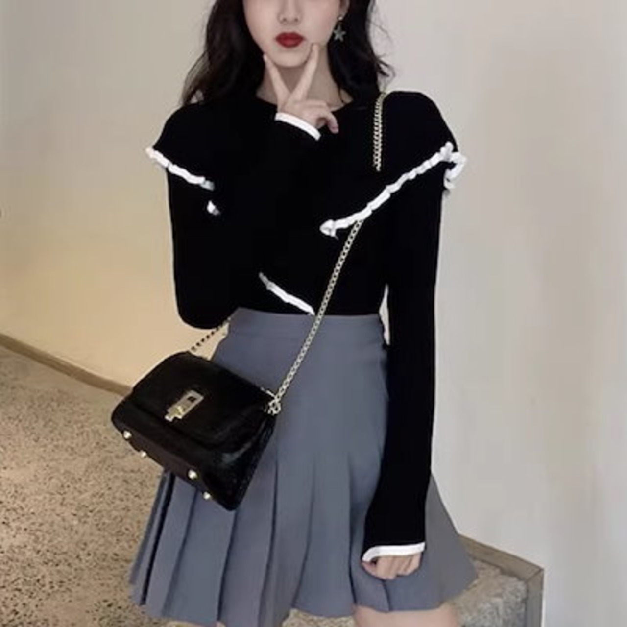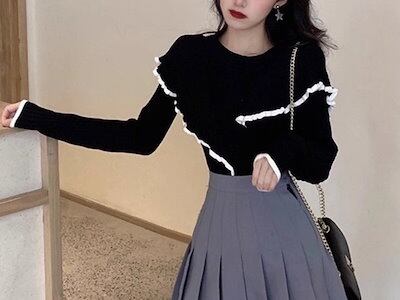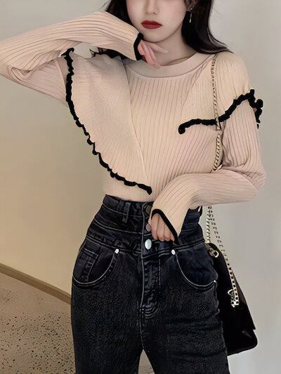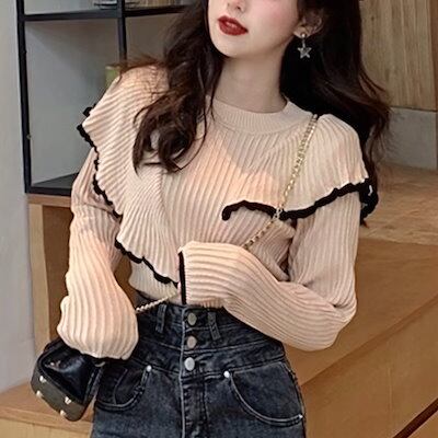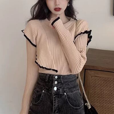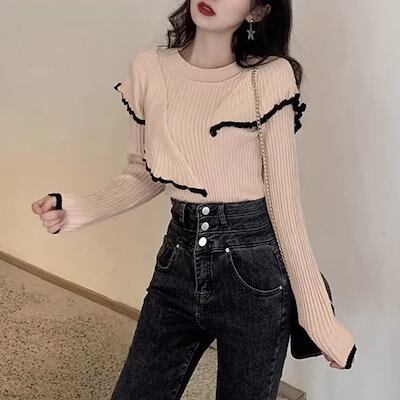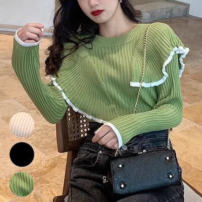 3色展開 フリル付きニット長袖セーター レディース トップス ロンT カットソー ニット セーター ミドル丈 レギュラースタイル 長袖 ラウンドネック スクープカラー スリム 細身 スリムフィット