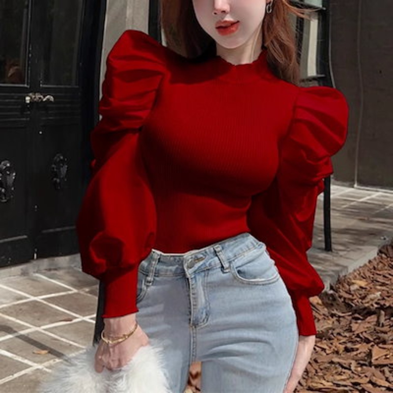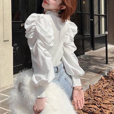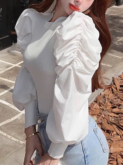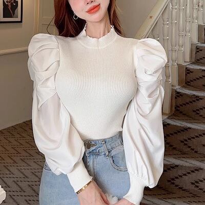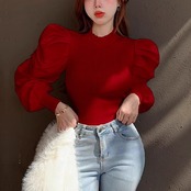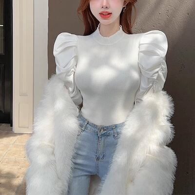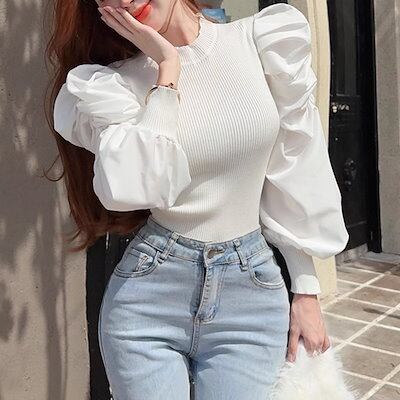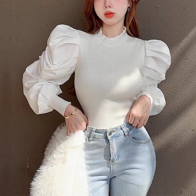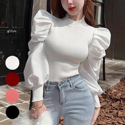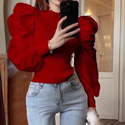 全4色 パフランタンスリーブのレトロなスリムフィットセーター レディース トップス ニット セーター ミドル丈 長袖 パフスリーブ ランタンスリーブ ラウンドネック スリム フォーマル フェミニン