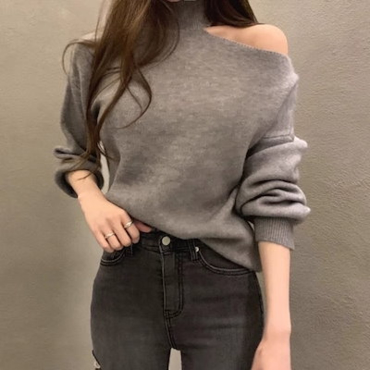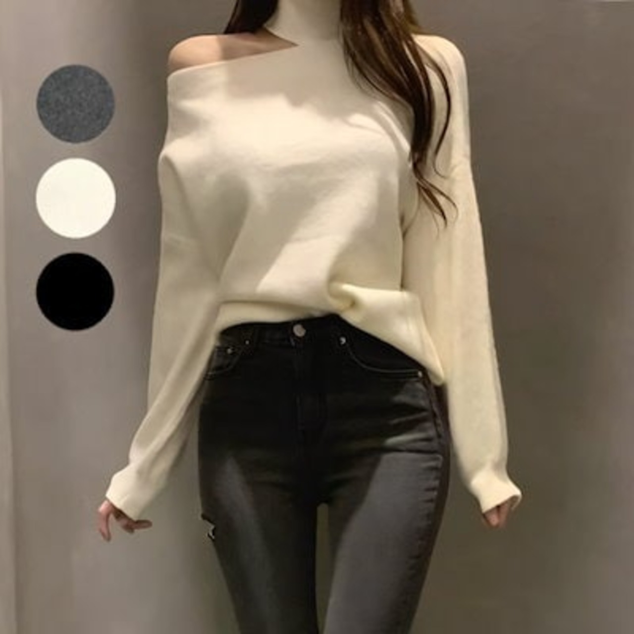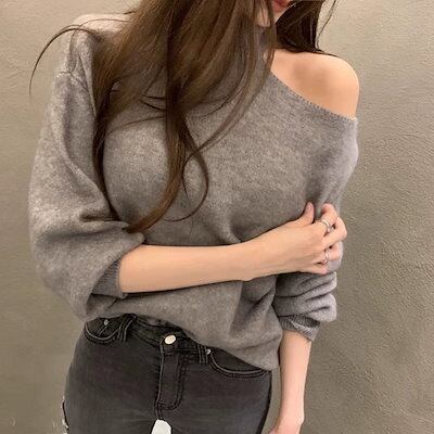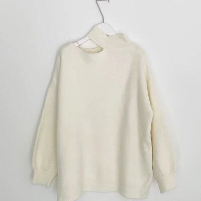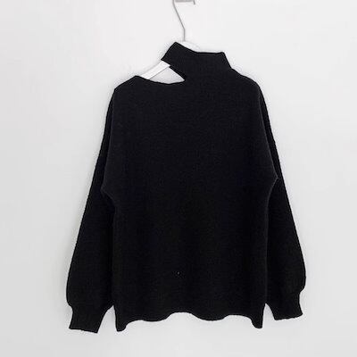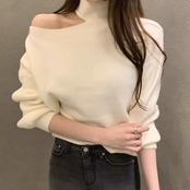 3色展開 フレンチニッチデザインオフショルダーセーター レディース トップス ニット セーター アウター 長袖 タートルネック ワンショルダー セミフレア ストレート アシンメトリー フェミニン