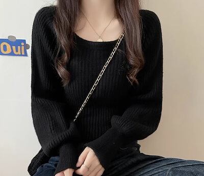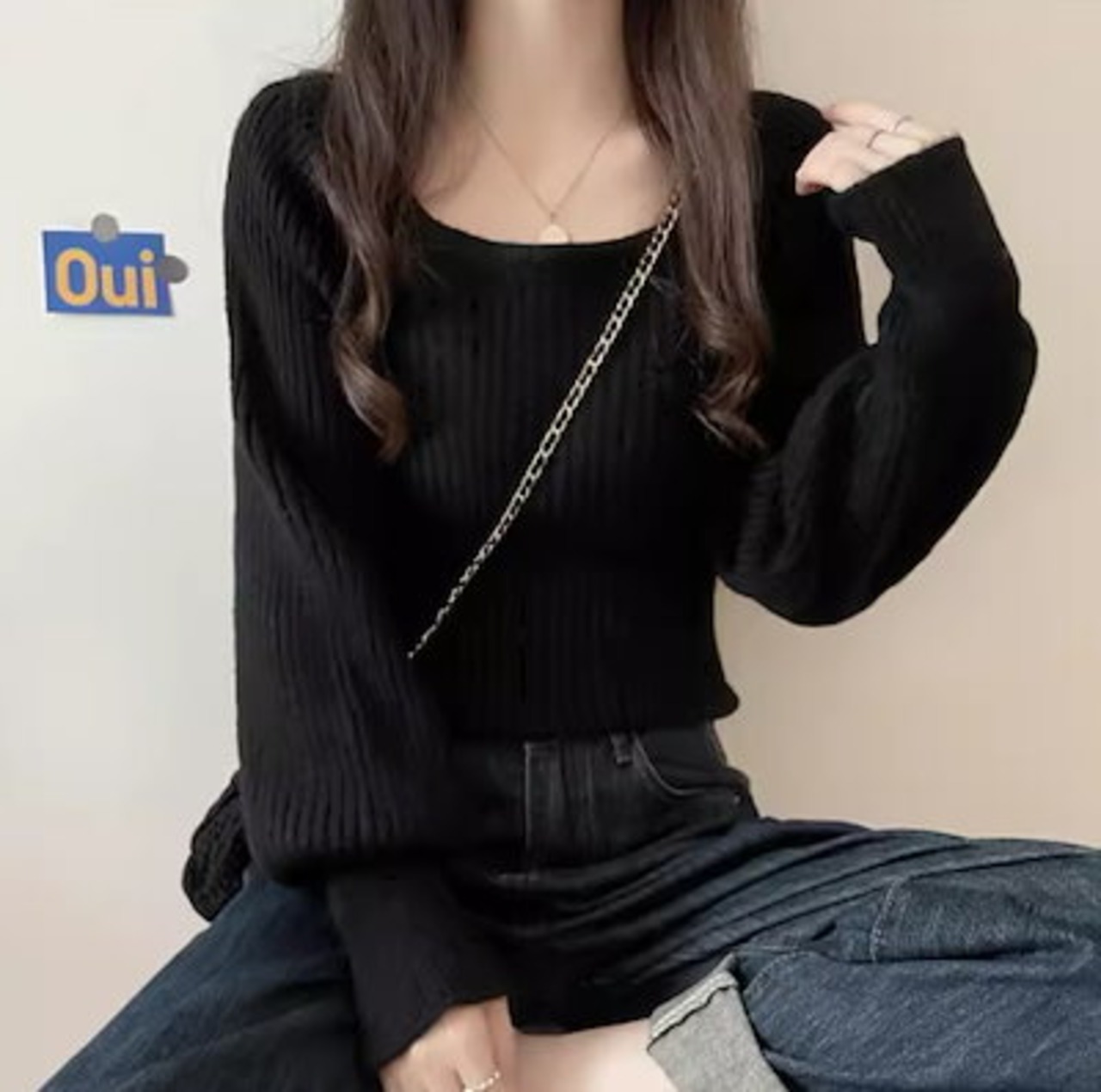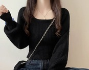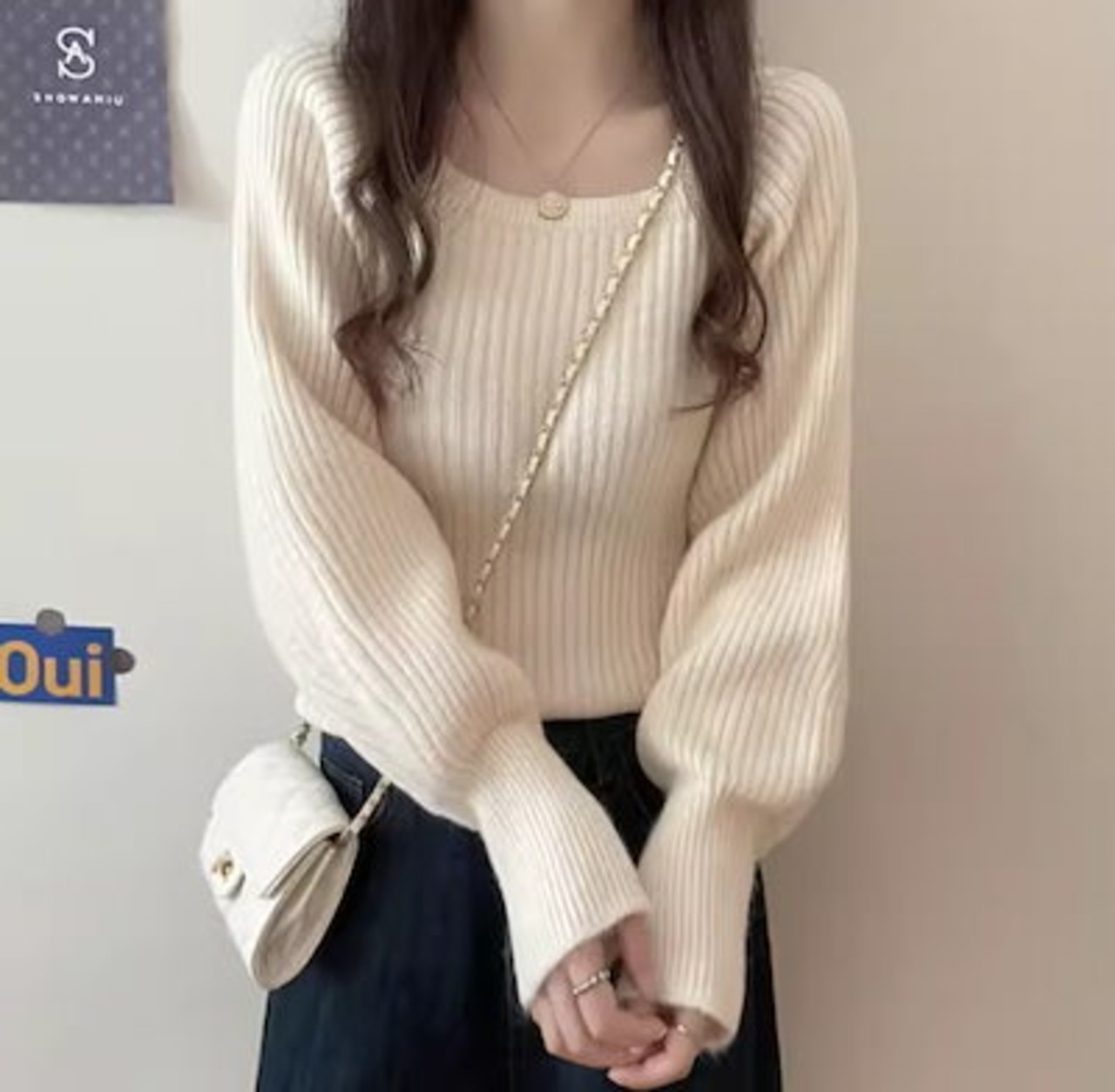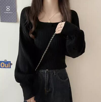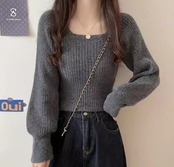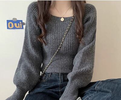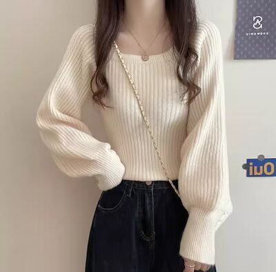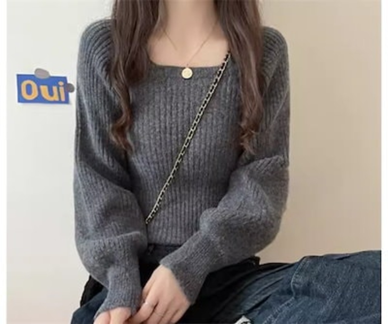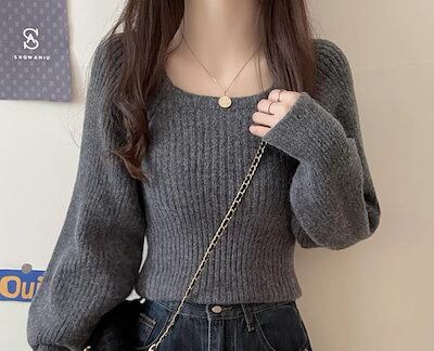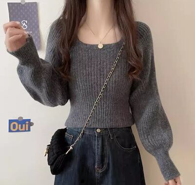 レディース トップス ニット セーター プルオーバー ミドル丈 長袖 ボリューム袖 パフスリーブ バルーン袖 スクエアネック 厚手 ストレッチ 伸縮性 かわいい 大人可愛い きれいめ シンプル