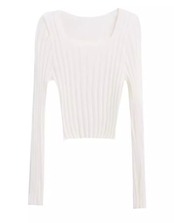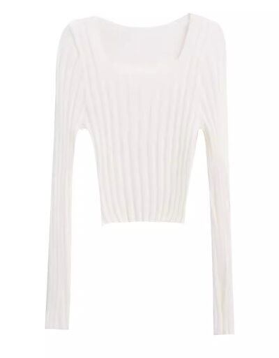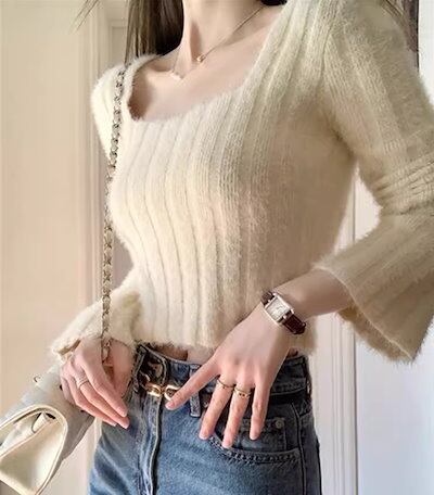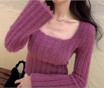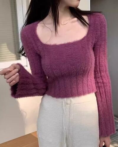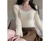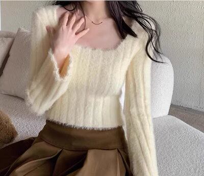 レディース インナー トップス ニット セーター プルオーバー ショート クロップド丈 長袖 スクエアネック タイト スリム 細身 フェミニン ストレッチ 伸縮性 かわいい 大人可愛い きれいめ