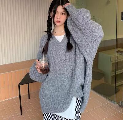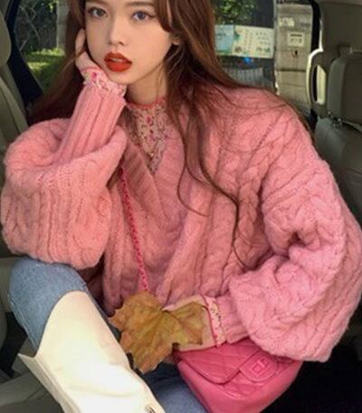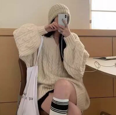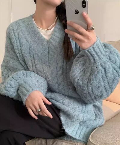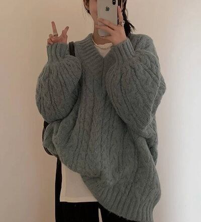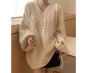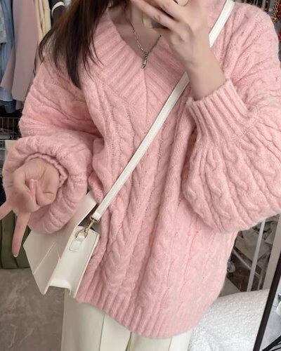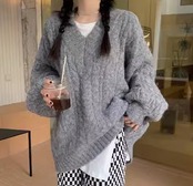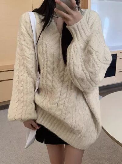 レディース トップス ニット セーター プルオーバー ミドル丈 長袖 Vネック ストレート フェミニン 厚手 ケーブルニット かわいい 大人可愛い シンプル カジュアル おしゃれ ラフ ボーイッシュ