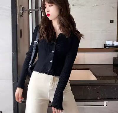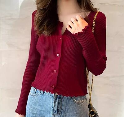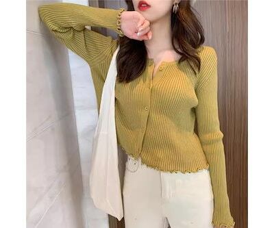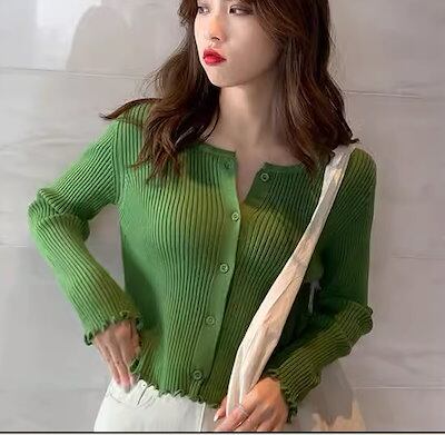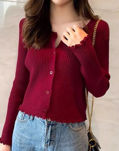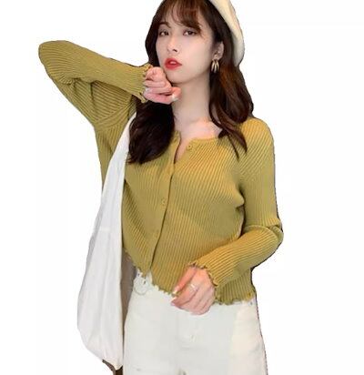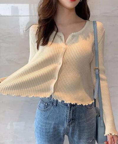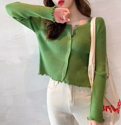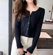 レディース トップス ニット カーディガン ショート クロップド丈 長袖 ラウンドネック フェミニン 前開き ボタン 薄手 かわいい 大人可愛い きれいめ シンプル カジュアル 上品 おしゃれ