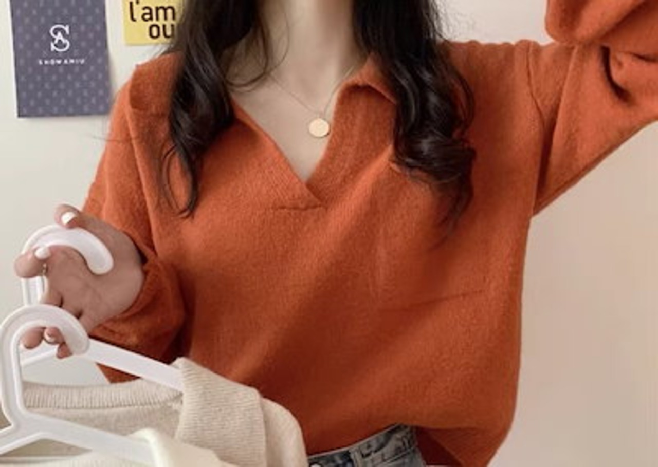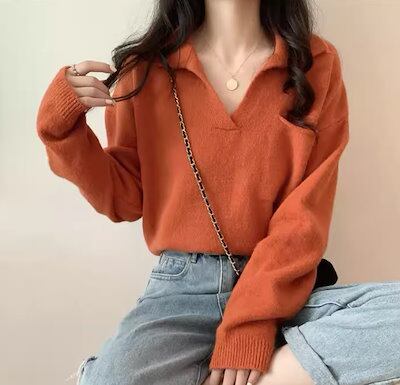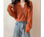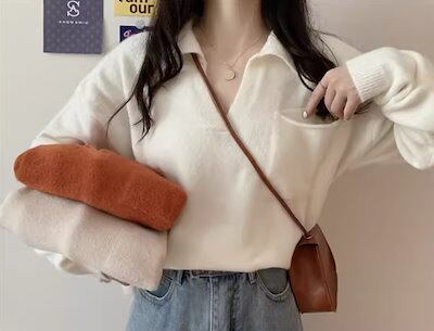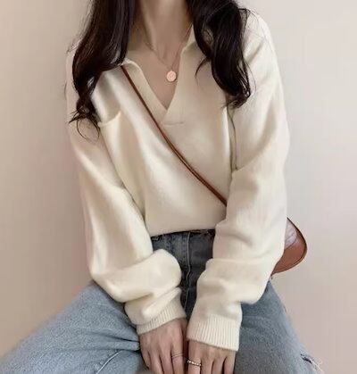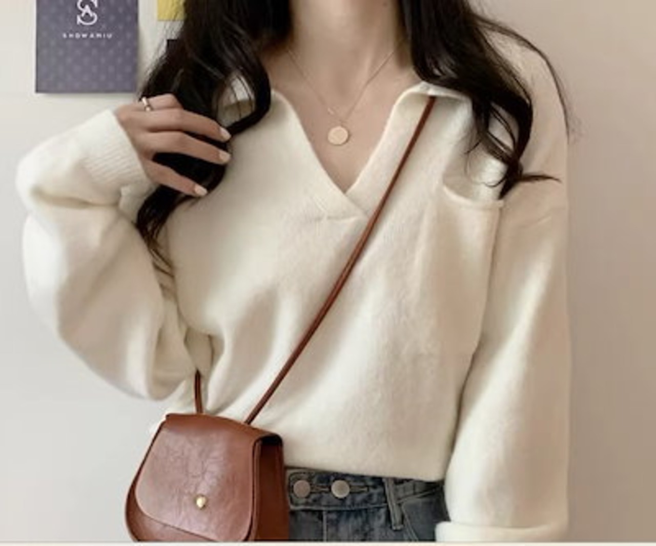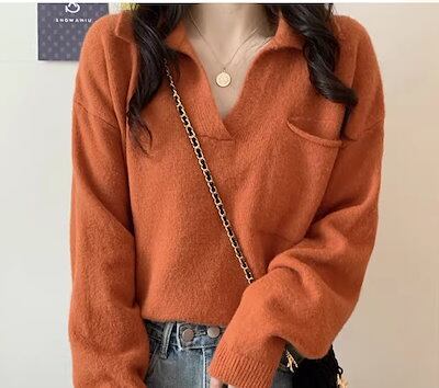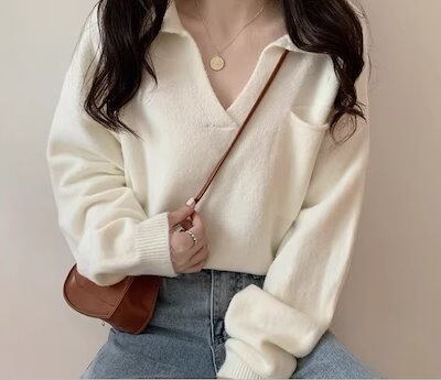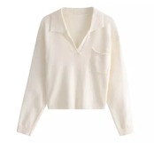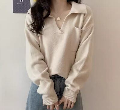 レディース トップス ニット セーター プルオーバー ショート ミドル丈 長袖 ドロップショルダー Vネック 襟付き ポロカラー ポケット かわいい 大人可愛い きれいめ シンプル カジュアル 上品