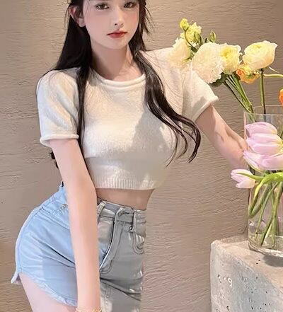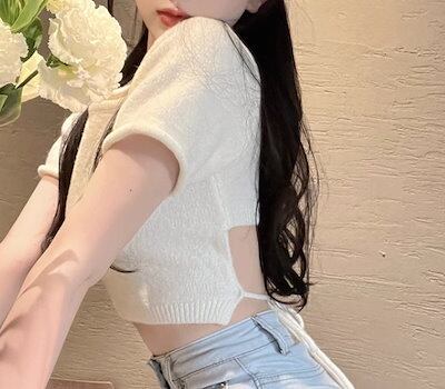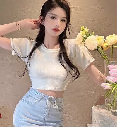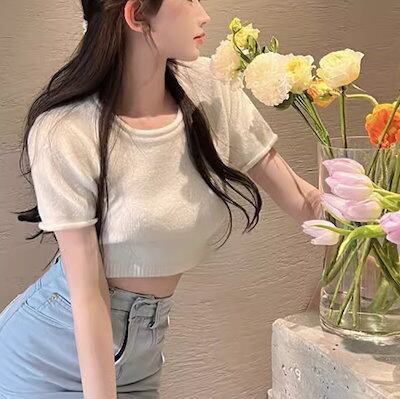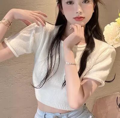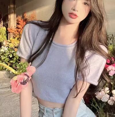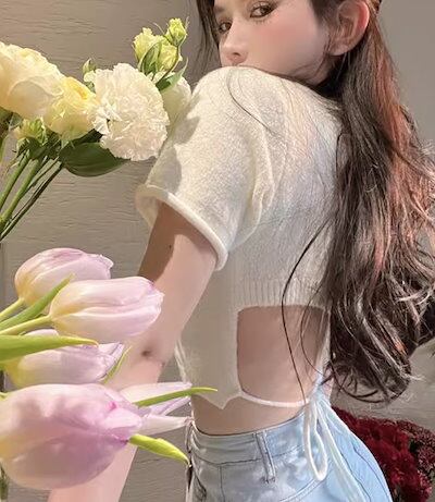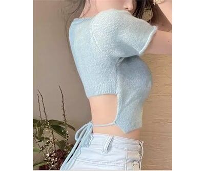 レディース トップス カットソー ニット セーター プルオーバー Tシャツ ショート クロップド丈 半袖 ラウンドネック 背中開き バックリボン かわいい 大人可愛い シンプル カジュアル おしゃれ