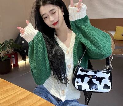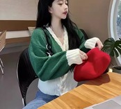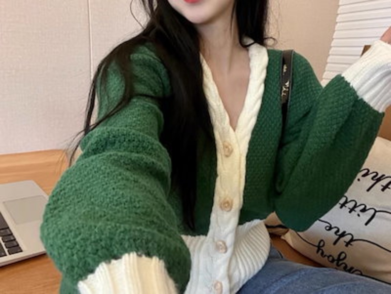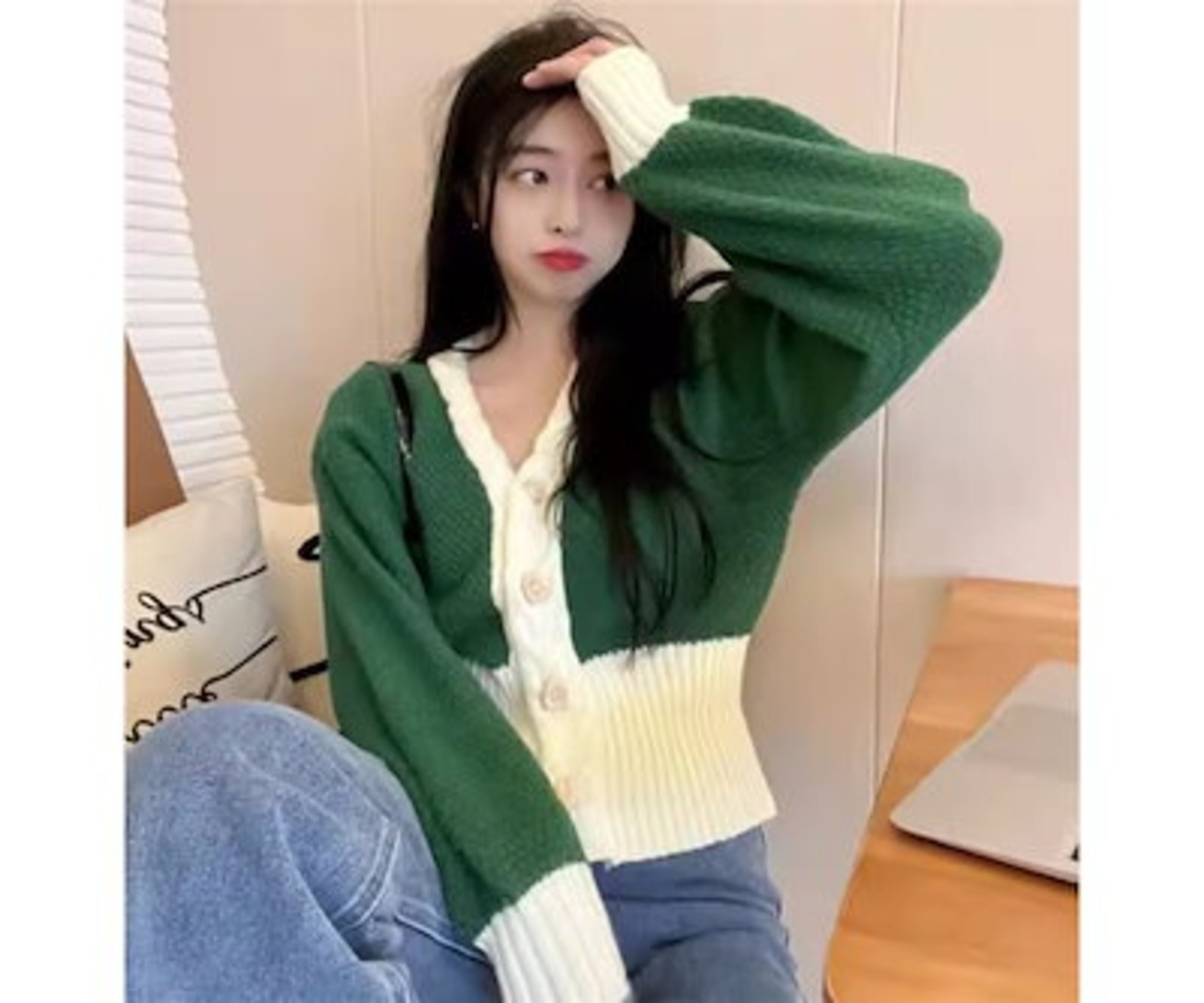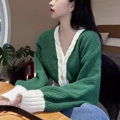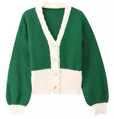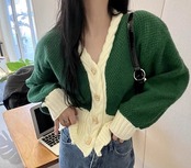 レディース トップス ニット セーター カーディガン ショート 長袖 ボリューム袖 バルーン袖 ランタンスリーブ Vネック 前開き ボタン バイカラー かわいい カジュアル おしゃれ レトロ ラフ