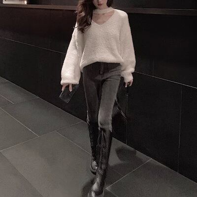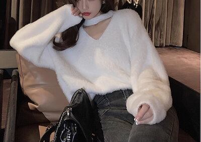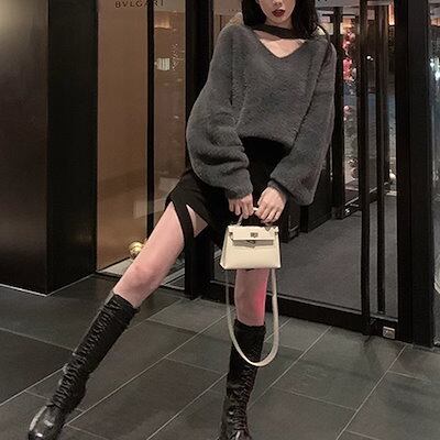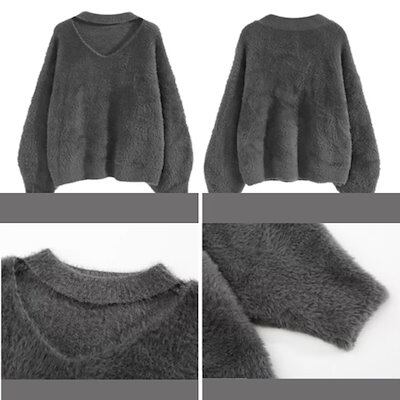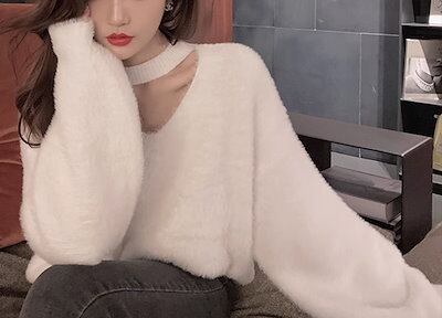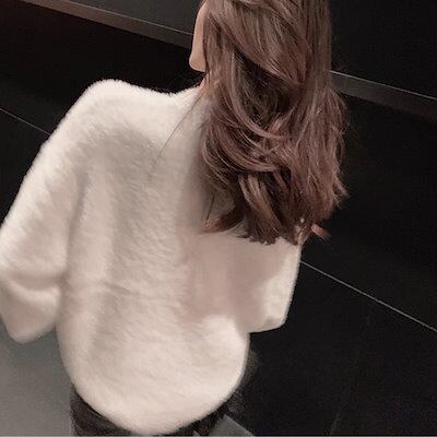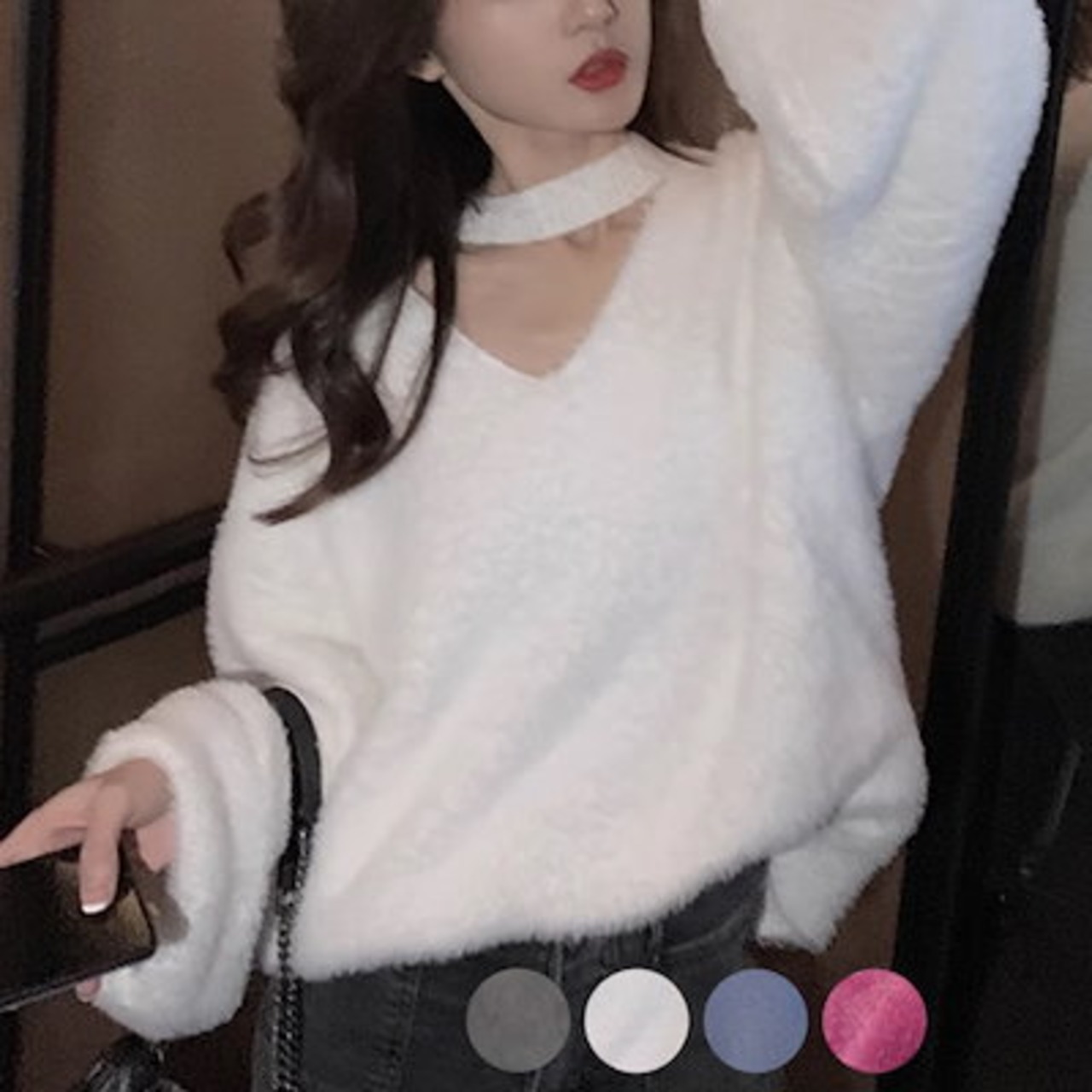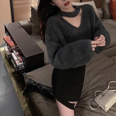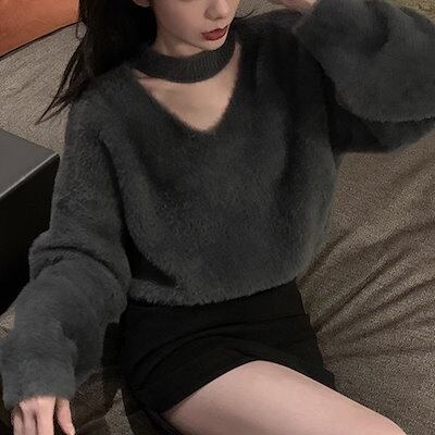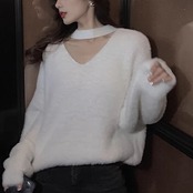 4色展開 ミンクベルベットモヘアセーター レディース トップス セーター ミドル丈 長袖 Vネック ホルターネック ワイド オーバーサイズ フェミニン ふっくら 伸縮性 モヘア ベルベット ウール